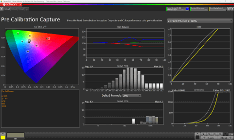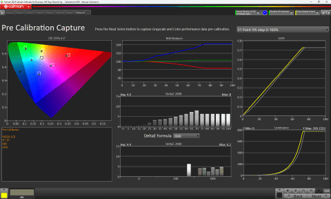 ・パターンジェネレータから、色温度D93/D65のHDR信号をテレビに入力。カラースペース(BT.2020)、EOTF、RGBバランス、色精度(デルタE)、10% Window(ピーク輝度)、100% Window(全白輝度)を、ソフトウェア「Calman Ultimate」で測定した