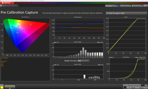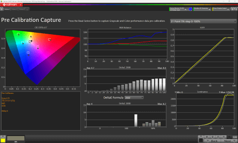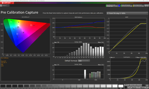・パターンジェネレータから、色温度D93/D65のHDR信号をテレビに入力。カラースペース(BT.2020)、EOTF、RGBバランス、色精度(デルタE)、10% Window(ピーク輝度)、100% Window(全白輝度)を、ソフトウェア「Calman Ultimate」で測定した