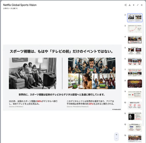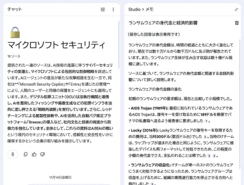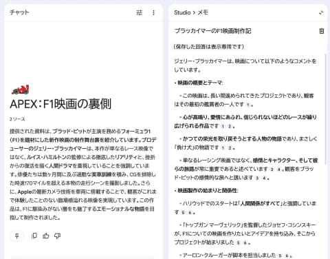 しかし、NotebookLMは音声だけでなくさまざまな資料や文章も加味して使えるのが特徴だ。結果として、その案件すべての視聴をまとめて作業できるからこそ使い勝手が良い……という話になる。まさに「案件ごとのバインダー」であるところに利便性がある、という見方もできそうだ。