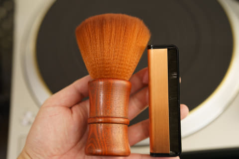 レコードのホコリを除去するクリーナーは、プラスチック筐体の細長いタイプを使っていたのですが、「もうちょっと手触りが良い、木製のものが欲しいな」と、Amazonのセールで天然木の筆っぽいデザインのものを購入。