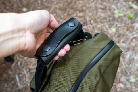 見た目はビジネス向けバックパックに多いスクエア型で、上部にハンドルがあるシンプルな見た目。国内生産で、価格は41,900円。カラーはブラックとカーキの2色で、筆者が購入した時はブラックは在庫切れだったので、カーキを購入した。