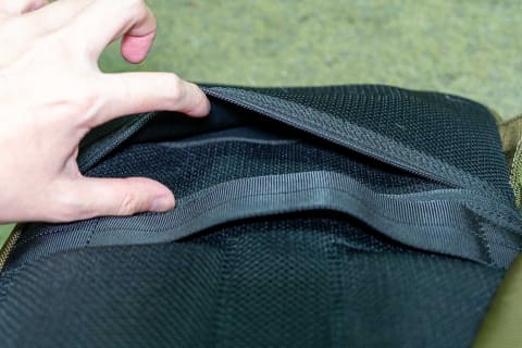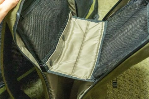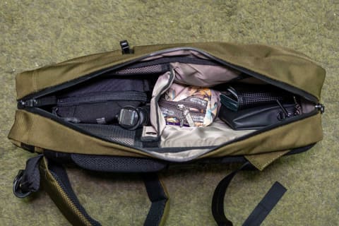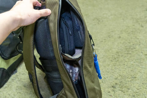 この仕切りは簡単になくすことができ、仕切りなしにすれば一般的なバックパックと同じように使えるので、長めの折りたたみ傘や帰宅途中に買った2リットルのペットボトルなども収納できる。