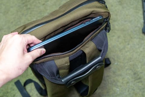 またメインの荷室とは別に、PC用ポケットが背面に、前面側にはA4サイズの書類が入れられるスペースも確保されているので、仕切りありの状態でもノートPCなどは問題なく収納可能だ。