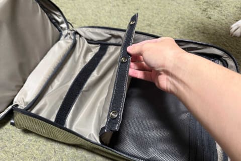 荷室内に面ファスナーとボタンで付け外しできる仕切りが用意されており、これを使うことでカバンの中を上下2部屋に分けることができる。仕切りでカバンの中身を分けるという構造は、カメラバッグで見かけることは多いが、ビジネス向けバッグではなかなか見かけない構造だろう。