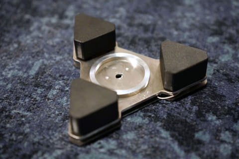 ピアノ用はキャスター部分を受け止めるために中央部がフラットになっているが、チェロとコントラバス用はオーディオ用と同様なアルミリングが付いている。その中央部に穴が空いていて、そこにエンドピンを嵌める仕組みだ。床に接する面には3本の小さなスパイクがあるが、これはウェルデルタ本体がすべるのを防ぐ効果を発揮する。
