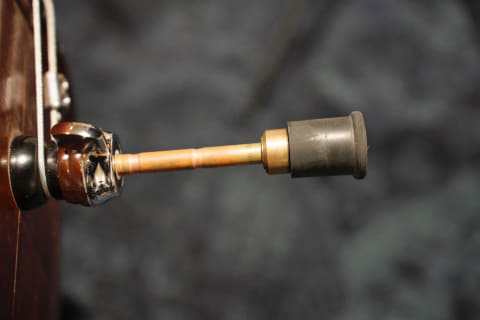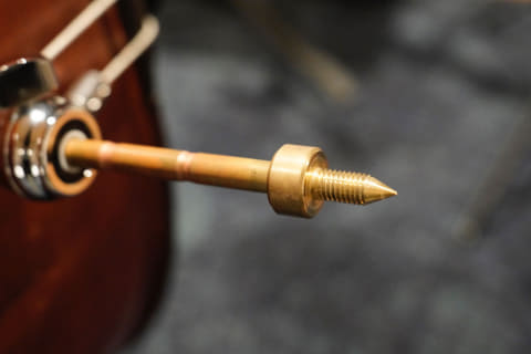 発音が速い音が欲しくてカーボン製のエンドピンに変えたことがあるが、スピードは上がっても音の芯や低音域の量感が犠牲になることに気付き、数年前に真鍮とタングステンのハイブリッド型エンドピンに変えた。