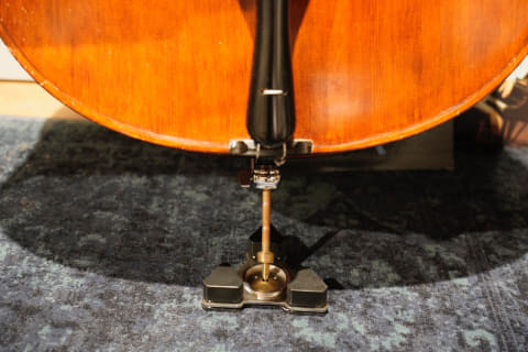 ヴァイオリンやヴィオラは演奏者の鎖骨付近で胴体の振動を受け止めるが、チェロとコントラバスは金属製のエンドピンを介して床に楽器を固定する。チェロは両膝で楽器を抱え、コントラバスは腰や左足の膝内側でボディを支えるのだが、楽器本体の振動エネルギーの多くはエンドピンから床に伝わり、その反動が楽器に返ってくる。