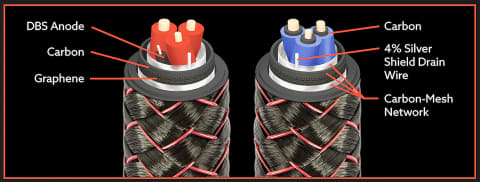 AudioQuestのハイグレードなケーブルでは悪影響を与える高周波信号の除去や振動対策が入念に行なわれている。Brave Heartではカーボン–メッシュ・ネットワークやグラフェンの採用が特徴になっており、よく見るとマイナス側に配された高純度の無酸素銅(PSC+=Perfect Surface Copper Plus)の単線にも、それぞれカーボンの被覆が使われているらしい。Brave Heartでは72VのDBSが使われていて、そのアノード線(陽極)はプラス側、カソード線(陰極)は外側に金属箔に接続されている。