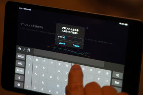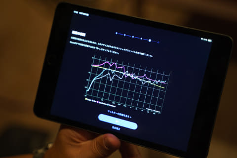 本機からテストトーンを発生させ、iPhoneを耳の高さに固定して内蔵マイクロフォンで集音、そのデータを元に周波数特性を補正するわけだ。補正カーブは写真の通り。低域から中低域を持ち上げる補正が行なわれているのがわかる。