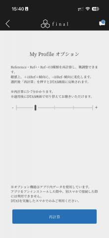 この微調整でも自然な音色に感じられない場合は、DTAS効果を再計算することもできる。再計算は5~7分程度で完了し、耳の再撮影などは不要。試しにマイナス方向にひとつ数値を下げて再計算したところ、こちらも刺さり感のない女性ボーカルを楽しむことができた。測定結果を調整して、より好みに近づけたい時は、これらの機能を使うと良いだろう。