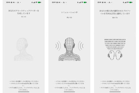 TONALITEには専用アプリが用意されており、アプリ内の指示に従って、上半身や耳の形状をスキャン。さらにイヤフォンを装着して、耳穴内部の特性も測定。そのデータを用いて、TONALITEをユーザーにマッチした音色のイヤフォンに最適化するのがDTASだ。