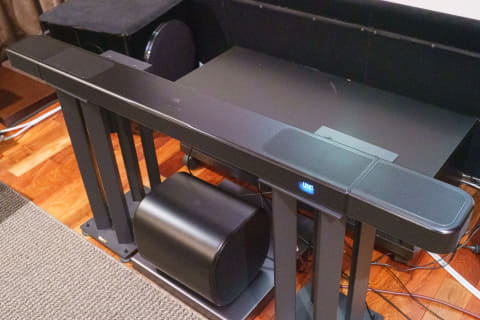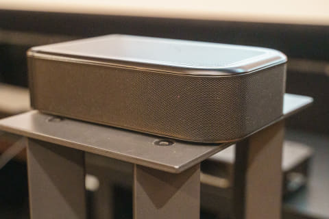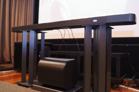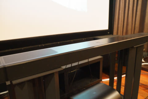 今回は、音質をよりシビアにチェックしたいので、ブックシェルフ用スピーカースタンド「TAOC HST-60HB」に設置した。鋳鉄スタンドで、高さは60cmあるので、常設しているパネル式スクリーンの直下に近い位置にサウンドバーを設置できる。サウンドバーとスクリーンの距離が近くなるのもポイントだ。