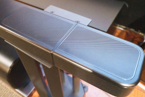 内蔵するスピーカーはなにしろ29個もあるのですべてを詳しくは紹介しないが、フロントやセンターは50×75mmレーストラックドライバー(センターは2発)と25mmツイーターの2ウェイ構成となっている。こちらも十分にパワフルなサウンドだし、アンプもかなりパワフルなのでサウンドバーだけで十分な帯域をカバーしていると思われる。