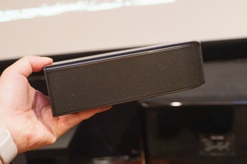 そのぐるぐる回る感覚を、BAR 1300MK2は見事に再現した。後ろにリアルなスピーカーがあるシステムならではの、ドーム状の立体的な音場空間が体感できる。ワイヤレスリアスピーカーはコンパクトながら、バッテリー容量も大きく約10時間使用可能。このあたりは、ワイヤレススピーカーのノウハウが生かされているだろう。小型でも音の迫力は満点と言っていい。