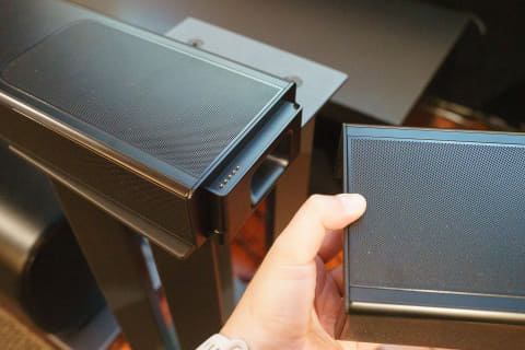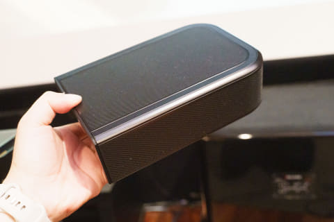 このサラウンドスピーカーが優れもので、50×900mmレーストラックドライバー×2、50mmフルレンジドライバーという構成。これに加えて75mm天井反射用フルレンジドライバーも搭載している。サイズとしては片手で持てるほどの小型軽量だが、帯域も立派なスピーカーを内蔵しているわけだ。