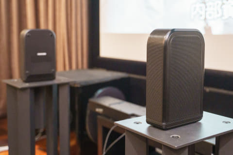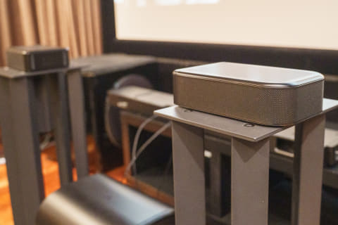 これらを部屋の後ろやサイドの適当な場所(本棚など)に置けばいい。取材では、もともとあるサラウンド用スピーカーのスタンド(高さ1mのやや高めのもの)に置いている。位置としては視聴位置の真横よりやや後ろあたりだ。