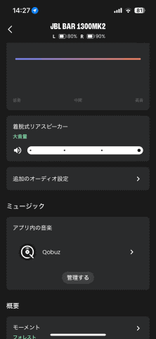 さらに、Bluetoothで手軽にスマホの音楽も再生できるほか、ネットワーク接続で多彩な音楽配信サービスに対応。QobuzやSoptify Losslessにも対応し、なんと最新のファームウェアアップデートでAirPlay経由でのDolby Atmos Musicのマルチチャンネル再生までできるようになった。部屋の音響特性に合わせた最適化を行なうキャリブレーション機能、スマホ用調整・設定アプリ「JBL ONE」も使用できる(以上BAR 300MK以降で対応)。
