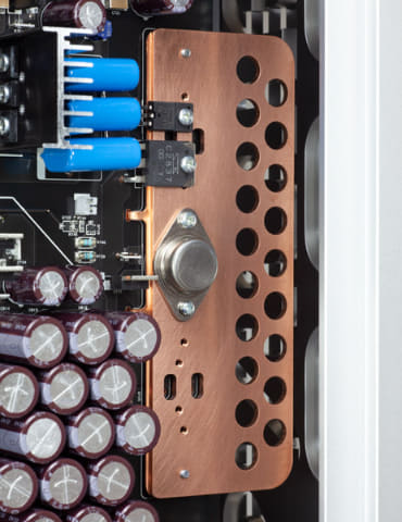 実のところ、オリジナルM3開発段階で、出力段のパラレル化は検討されていた。出力トランジスターが取り付けられるバスバー兼用の銅製ヒートシンクに謎の小孔が開いているのはそのため。それはこのクラスのパワーアンプは、現代ハイエンドスピーカーに組み合されることが多いと想定され、その場合、パワーと電流供給能力が高い方が有利だからだ。