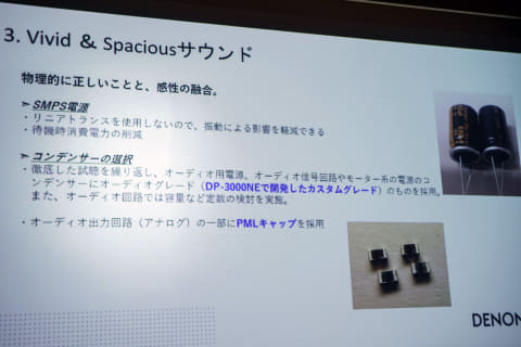 徹底した試聴を繰り返し、オーディオ用電源、オーディオ信号回路やモーター系の電源のコンデンサーに、DP-3000NEの時に開発したカスタムグレードのものを採用。オーディオ出力回路(アナログ)の一部にPMLキャップも使っているとのこと。