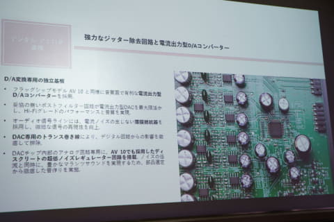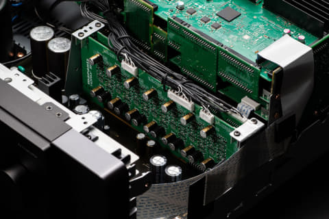 11.4chのデジタル信号処理や音場補正、最大4基のサブウーファーのバスマネージメントなどは、AV 10と同じ最新のデュアルコアDSPを使用。すべてのチャンネルのD/A変換回路は独立した基板とし、外部からの影響を最小としている。パーツの配置や信号経路も最適化している。もちろん、DACチップはAV 10と同じ電流出力型として、8chDACを2個搭載。