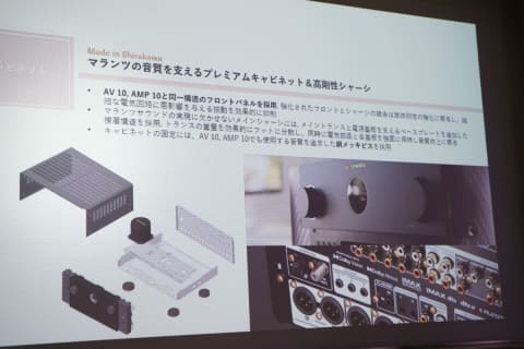 筐体は、フロントパネルはAV 10と同一構造。シャーシの剛性強化に貢献している。メインシャーシにはトランスと電源基板を支えるベースプレートを追加した構造になっている。なお、AV 10は側板をアルミとしているが、AV 30では側板と天板が一体化したスチール製としている。また、奥行きはAV 10の503mmからAV 30では414mmとなり、設置スペースも多少小さくなっている。重量は16.8kgから11.1kgとなりかなり軽くなった。音の点では特にアンプは重くてナンボという意見もあるが、年をとった筆者にしてみれば軽くて運びやすいのはありがたい。