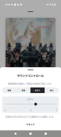 アプリで広さと高さ調整をプラスにしていくと、ライブ会場の空間がグングン広がり、高さも見上げるほどになる。最大値まで設定すると、「部屋が広くなる」を通り越して、部屋の壁が消滅して、屋外になったような感覚。部屋の照明を落とせば、本当に屋外で聴いているようだ。