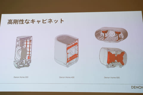 特にDENON HOME 600は、165mmと大型のウーファーを2基も搭載し、ユニットから強烈な振動が発生する。しかし、2基を背中合わせで配置することで、互いの振動を打ち消し合っている。こうした技術は、ピュアオーディオ用スピーカーや、ホームシアター用のサブウーファなどで使われるものだが、そうしたノウハウが、DENON HOME 200/400/600に投入されているわけだ。
