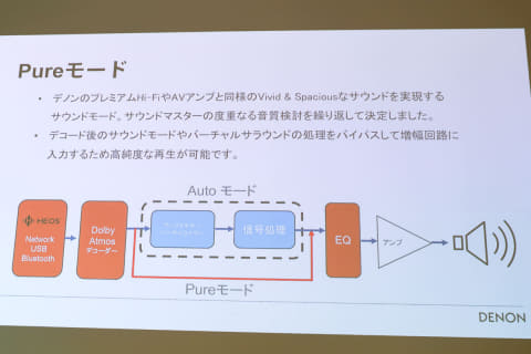 もう1つ面白いのは、デノンのサウンドバーで人気の“Pureモード”も搭載されていること。