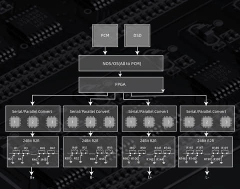 またその分で多くの抵抗器を搭載できるため、我々のR2R DACは192個もの抵抗を搭載していてフルバランスに完全に対応しています。(注:前述のように1チャンネルあたり、Rと2Rの抵抗ペア(2個)が24bit分必要なので、フルバランスの4チャンネルでは48x4=192個が必要となる)