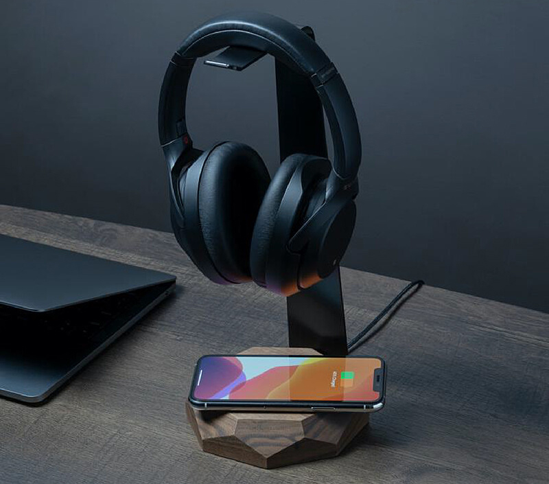 木製のベース部分にQiワイヤレス充電器を内蔵したヘッドフォンスタンド