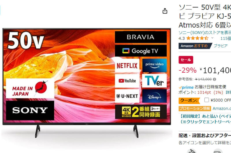 Amazonでソニー4K液晶ブラビア「X80WK」最大34% OFF。50型が約10万円