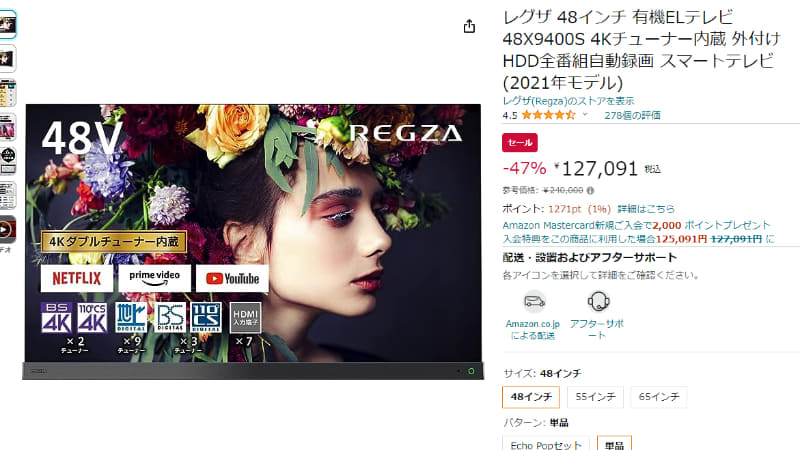 Amazonで、48型4K有機ELレグザが127091円。47% OFF