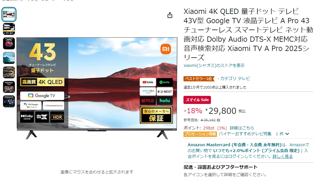 シャオミ4Kチューナーレステレビが29800円に。量子ドット採用で43型