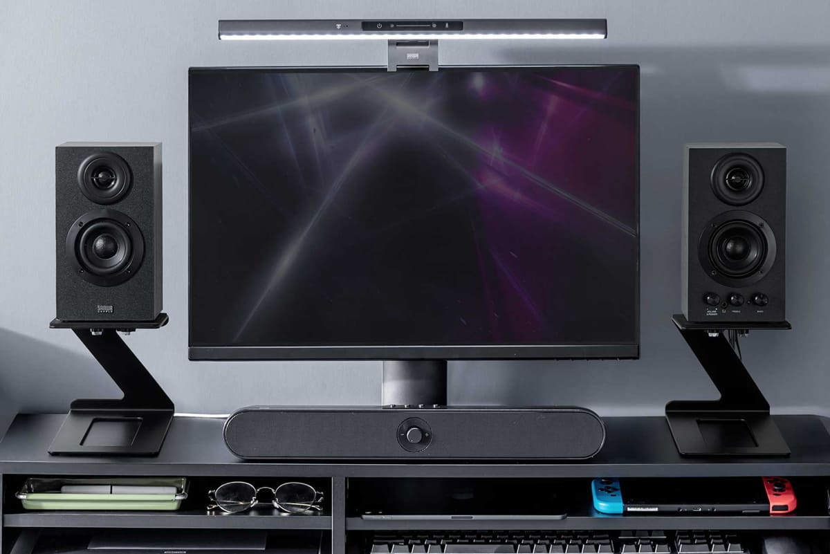 モニタ横にスピーカーを浮かせて設置するスタンドに白モデル