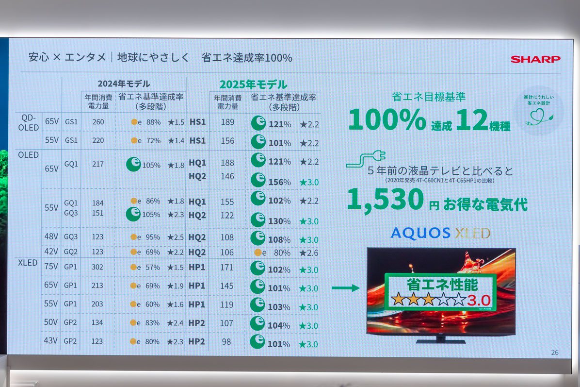 シャープ、省エネ性能を高めた4K有機ELアクオス「GQ3」
