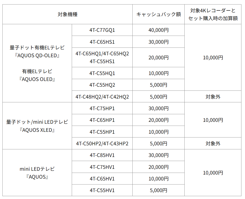 シャープ、「エンタメおまかせAQUOS」キャッシュバック。最大5万円還元