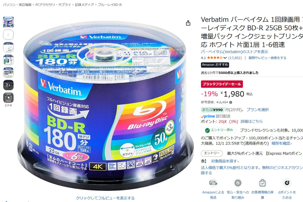 バーベイタム録画用BD×53枚が1980円に。Amazonブラックフライデー