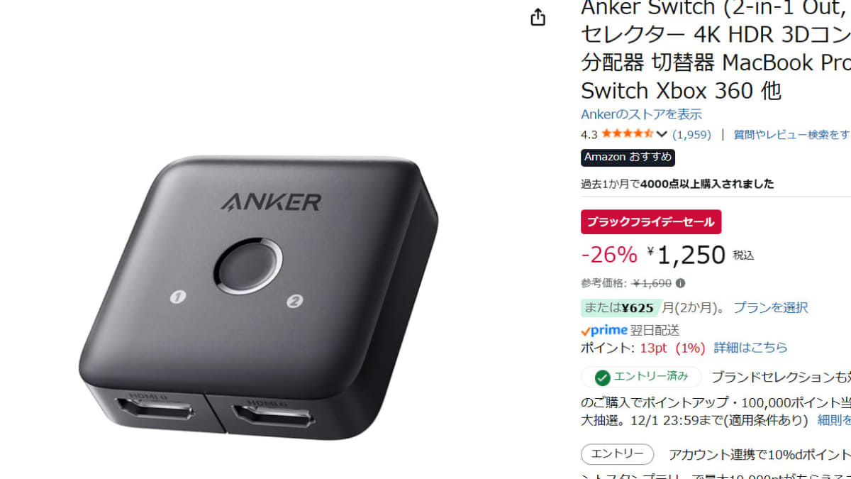 アンカーの4K対応HDMI切替器が1250円。Amazonブラックフライデー