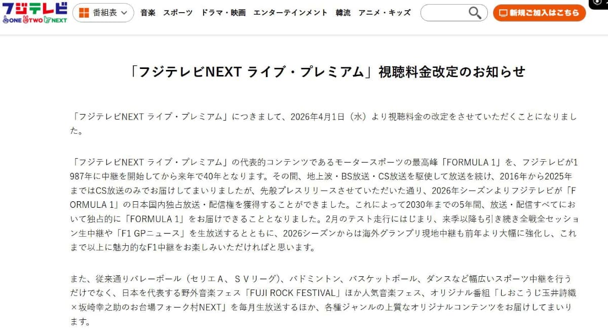 フジテレビNEXT、4月から視聴料金値上げ。今年もF1全戦放送